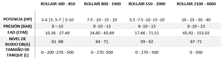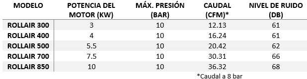Tabla 2. Información Técnica de Rollair 300 - 850.